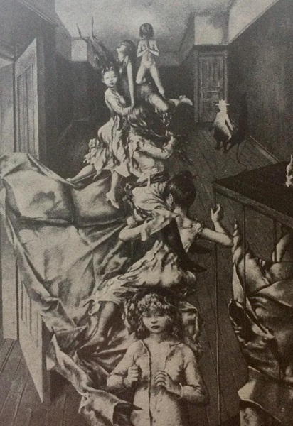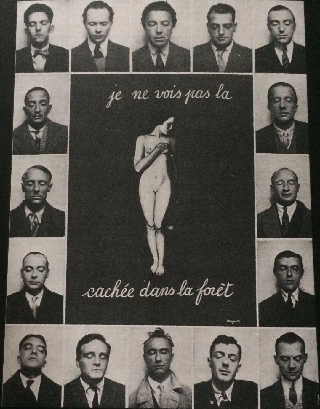 Photomontage with portraits of sixteen surrealists around the painting Je Ne Vois Pas La Femme Cahchee Dans La Foret published in La Revolution surrealiste, number 12, December 1929