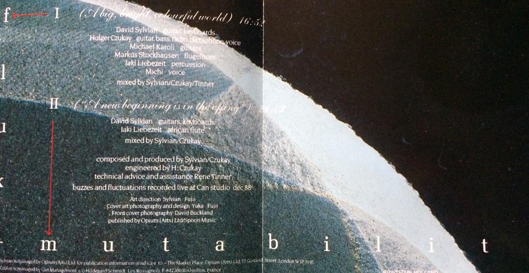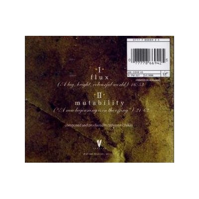 | David Sylvian & Holger Czukay Sylvian CD :: Vinyl :: Memorabilia Price Guide ~ Nov. 16 Perspectives Search Site FLUX AND MUTABILITY belongs to that rare category of albums--including such masterpieces as Cocteau Twins' VICTORIALAND, Talk Talk's SPIRIT OF EDEN, and Sylvian's own BRILLIANT TREES--whose impossible beauty suggests the likelihood of angelic intervention. The splendid ambient weave of A Big Bright Colourful World interlaces Sylvian, Czukay, and Karoli's fragile guitar lines, Czukay's radio and dictaphone samplings, Sylvian's warm, lambent keyboards, Liebezeit's nearly subliminal percussion, the multihued flugelhorn of Markus Stockhausen (yes, Stockhausen fils), and Michi's ephemeral utterances. The music develops and matures in timeless suspension befitting the album's title.